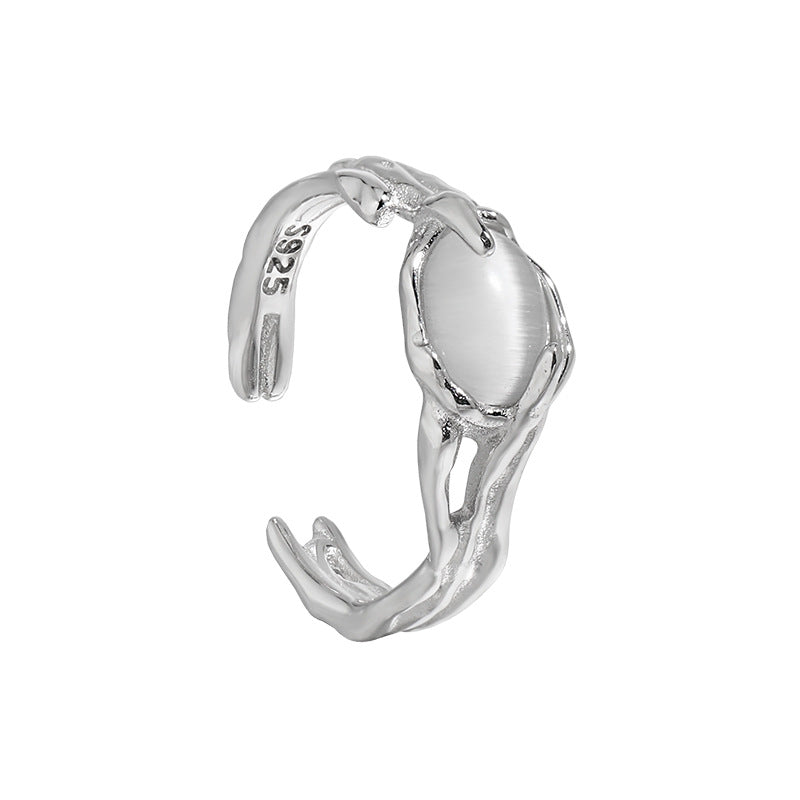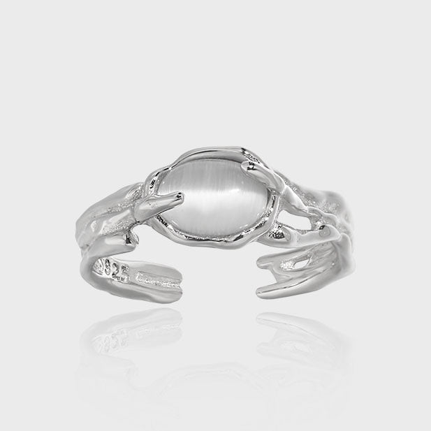 Embrace a cosmic allure with the Lunar Gaze adjustable ring by Sparkgasm. Crafted from 925 sterling silver, this unique piece features an oval-shaped created cat's eye stone, glowing with an enchanting, mystical light.