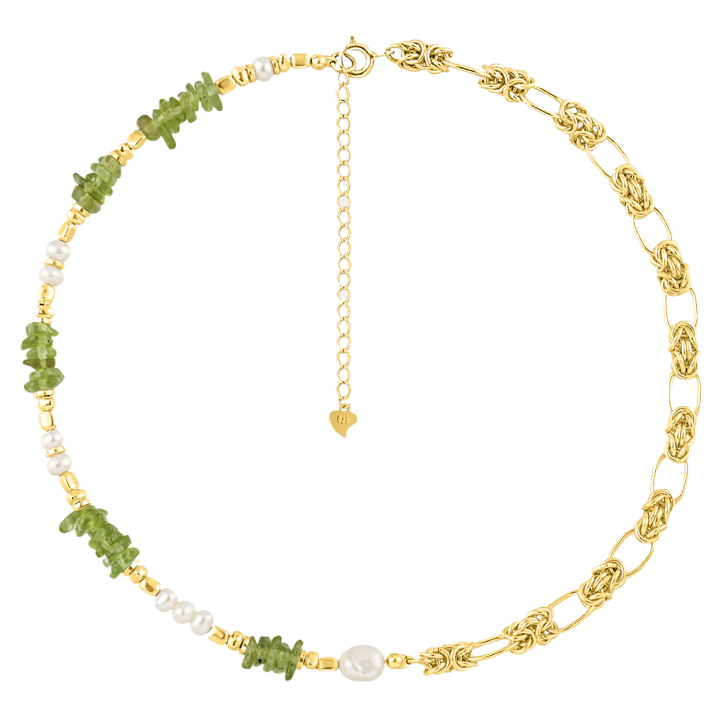 Indulge in the allure of timeless elegance with the Lustrous Harmony Necklace. A stunning fusion of nature's finest elements, this captivating piece features a luminous natural pearl paired with vibrant peridot, bringing a soft but dazzling contrast to your neckline. The intricate patchwork design in polished 925 sterling silver drapes beautifully, like a whispered secret against your skin.